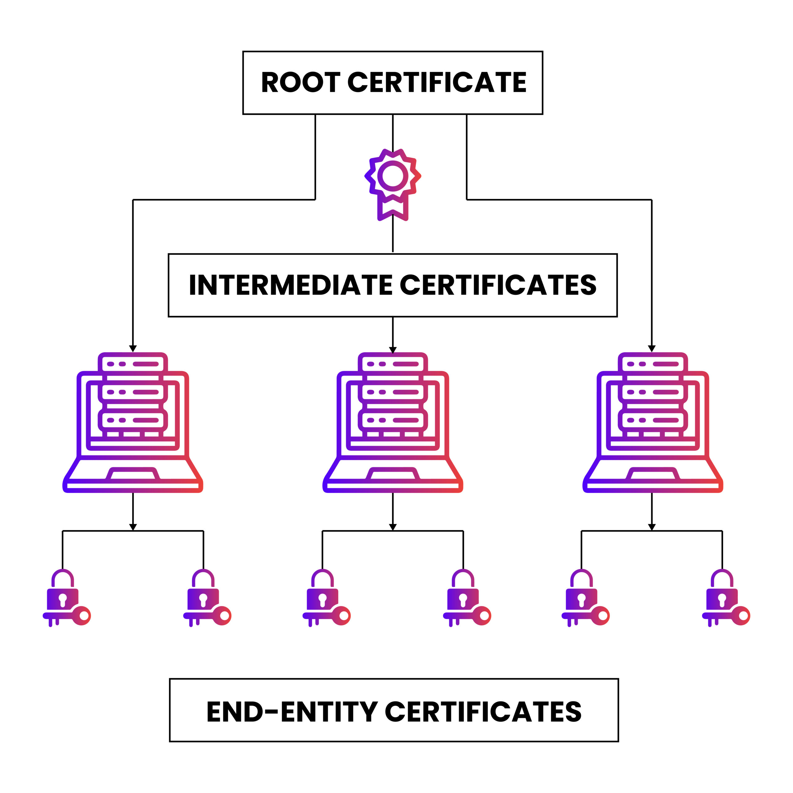 Root certificates sit at the base of the certificate chain of trust and typically have longer validity periods (10 or 20 years) than intermediate certificates. However, when they expire (or need to be replaced), it affects the entire trust chain, including intermediate and end-entity certificates.