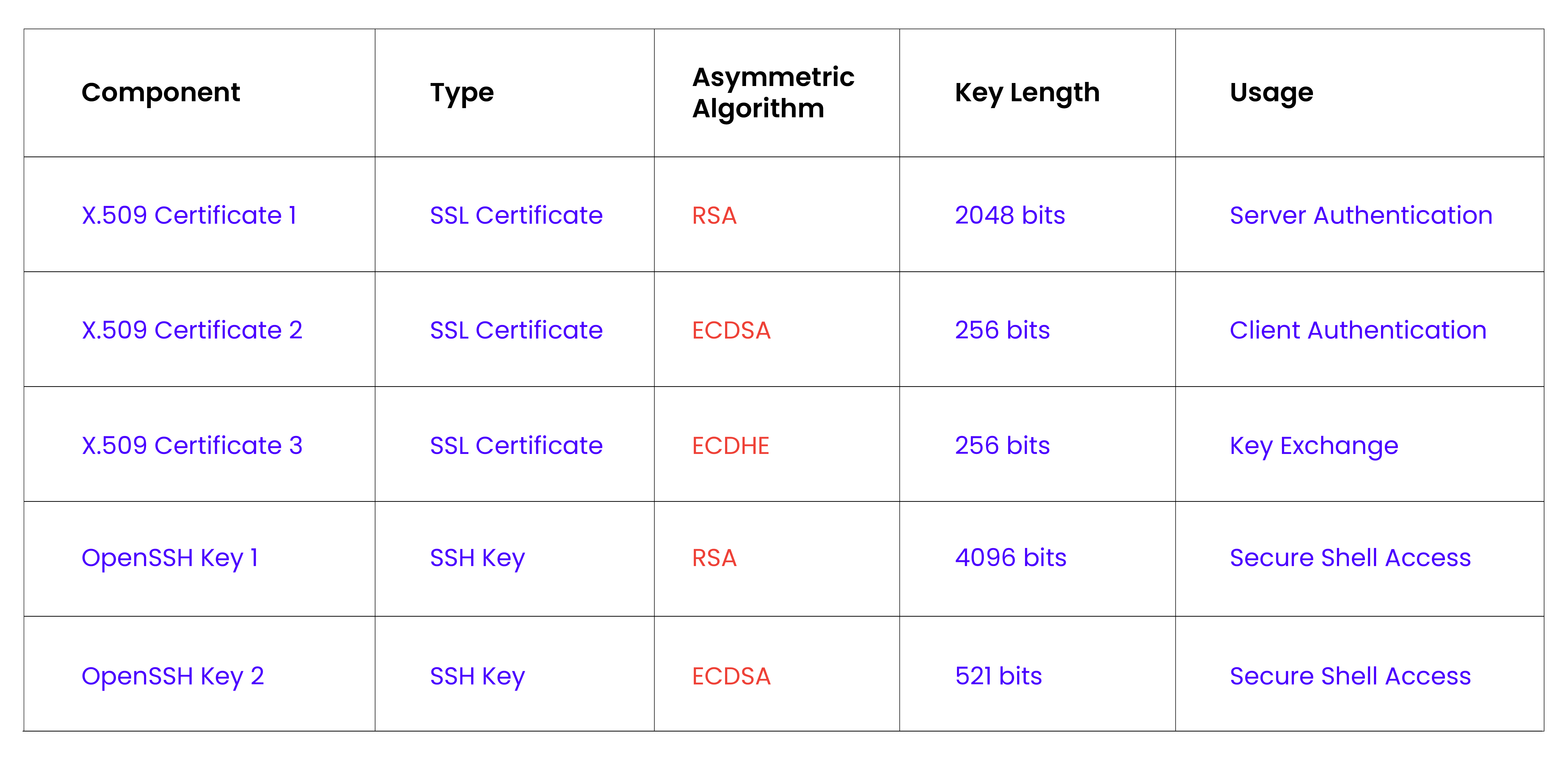Additionally, the key lengths indicate the security strengths of each asymmetric algorithm. By understanding these strengths, it can better inform a PQC transition strategy to align with the equivalent security levels of PQC algorithms such as ML-KEM, ML-DSA, and SLH-DSA.