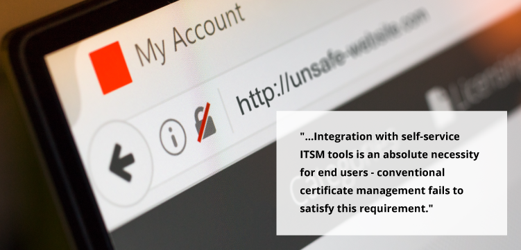 Outsourcing PKI management could certainly be an option, but using a managed service can be expensive. Certain organizations have stringent policies in place that do not allow the control of PKI infrastructure to leave the premises, and rightly so – PKI is critical and requires high levels of security considerations (usually, Service Criticality 1 is established). Again, this places the burden of deploying and maintaining certificates on internal teams. Many tools exist to help with certificate management, but they often don’t integrate with other IT solutions. Others require advanced knowledge of programming, PKI, or both – which may not be readily available within the network or DevOps teams. Furthermore, the digital era creates a tremendous need for certification lifecycle automation workflows that cater to industry needs such as DevOps, and integration with self-service tools like ITSM is an absolute necessity in order to satisfy the needs of end users, which conventional certificate management methods fail to accomplish.