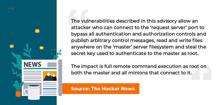 According to news agencies, the vulnerabilities germinated from the solution’s master-slave communication channel, allowing attackers to bypass authentication/authorization controls and connect to the master server, access all its files, steal the encryption keys, and remotely execute commands as root on both the master and the minions. As researchers from F-secure, the cybersecurity firm that discovered the vulnerabilities, put it,