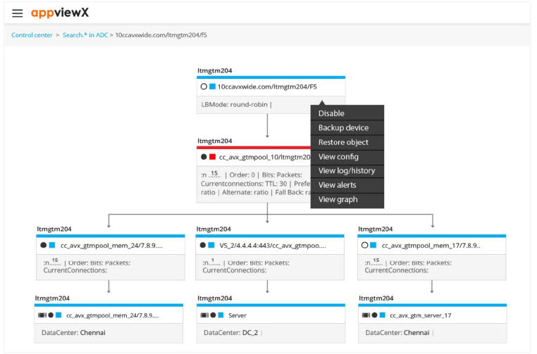 While the single-pane GUI-based all-inclusive dashboard helps businesses monitor metrics such as performance, traffic flows, and CPU usage, the topology map views from the ‘Control Center’ and reports display the relationship between various objects like load-balancers, firewalls and others related to the application and its services.